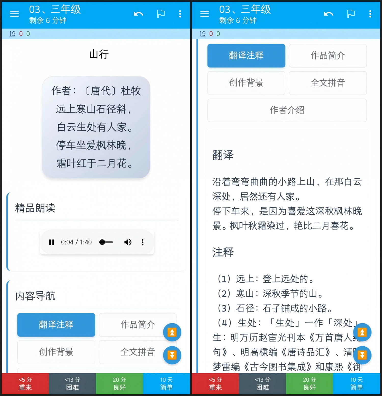 ✅ 全覆盖:1-6 年级部编版必背 120 + 首(从《咏鹅》《江南》到《送元二使安西》《己亥杂诗》),小升初直接用;