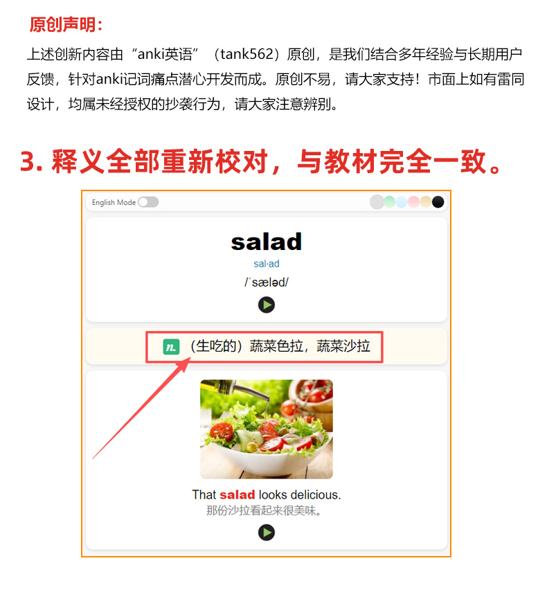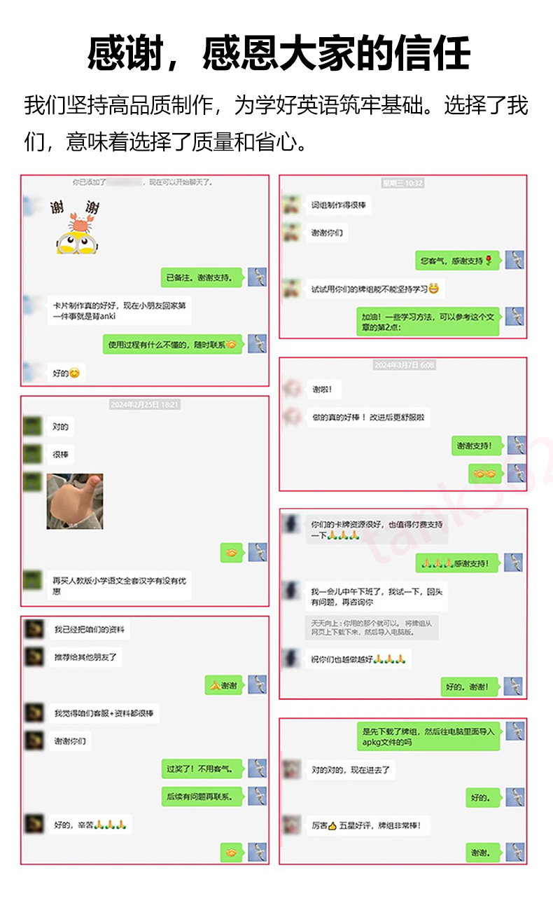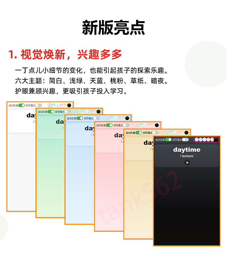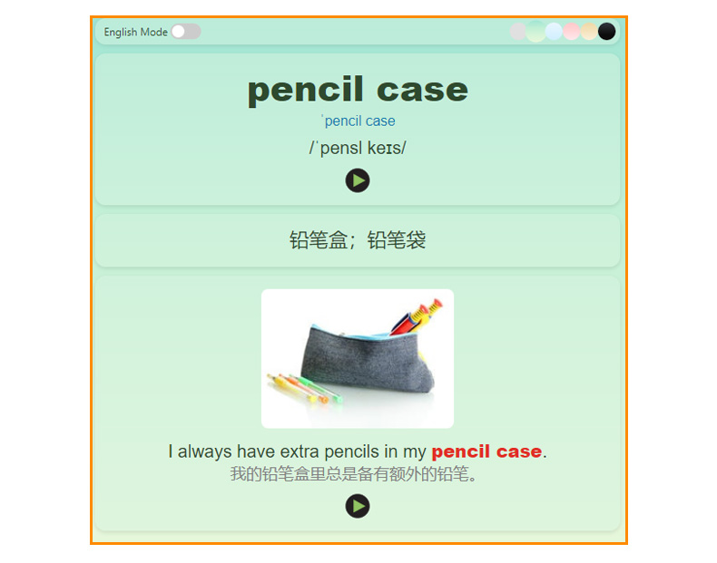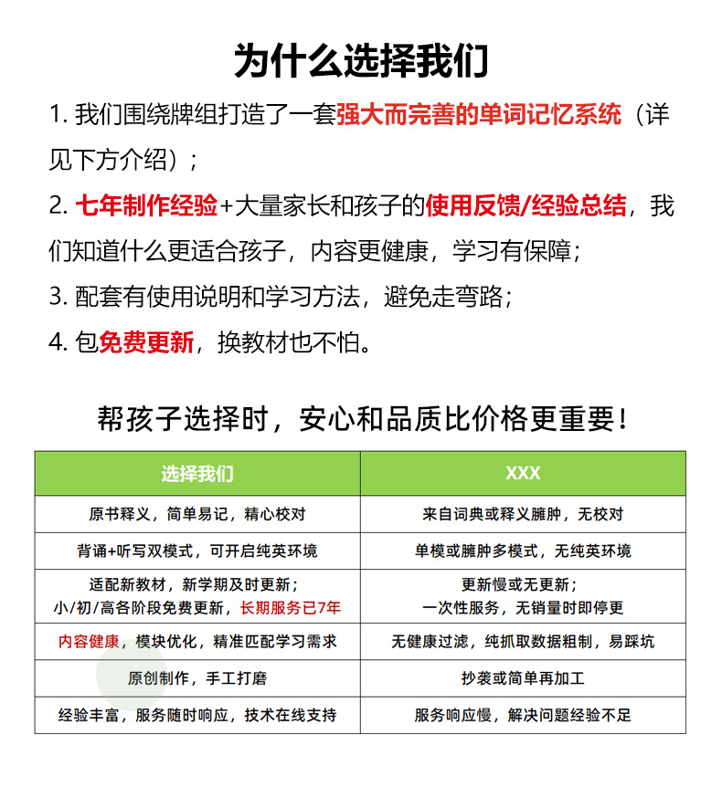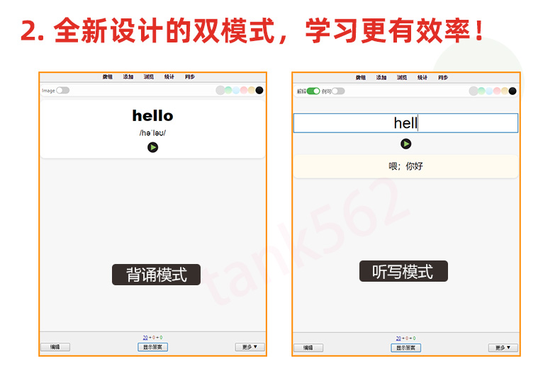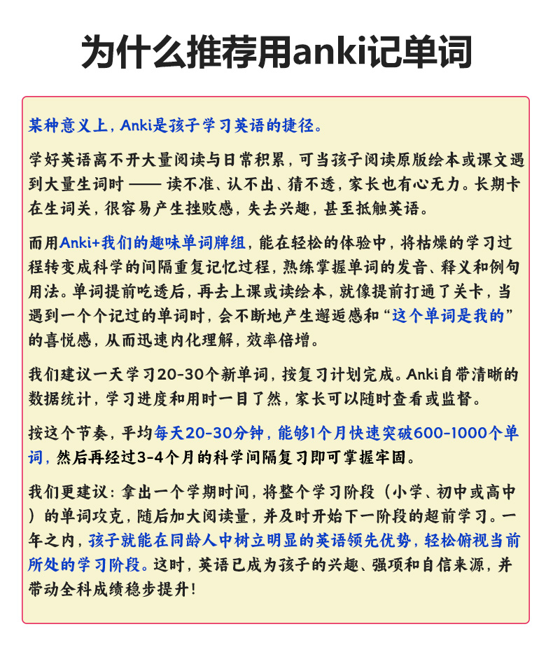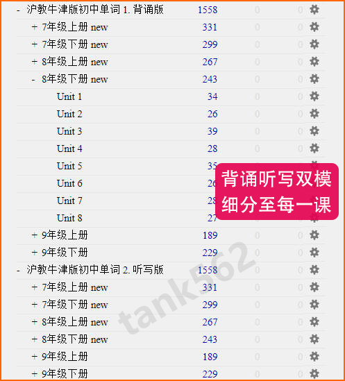 卡片严格按照课本上的单元顺序(非字母排序),细分至每个单元,集成了背诵和听写两个版本(可拓展为更多模式),既方便日常记忆,也便于随堂默写和预习。
