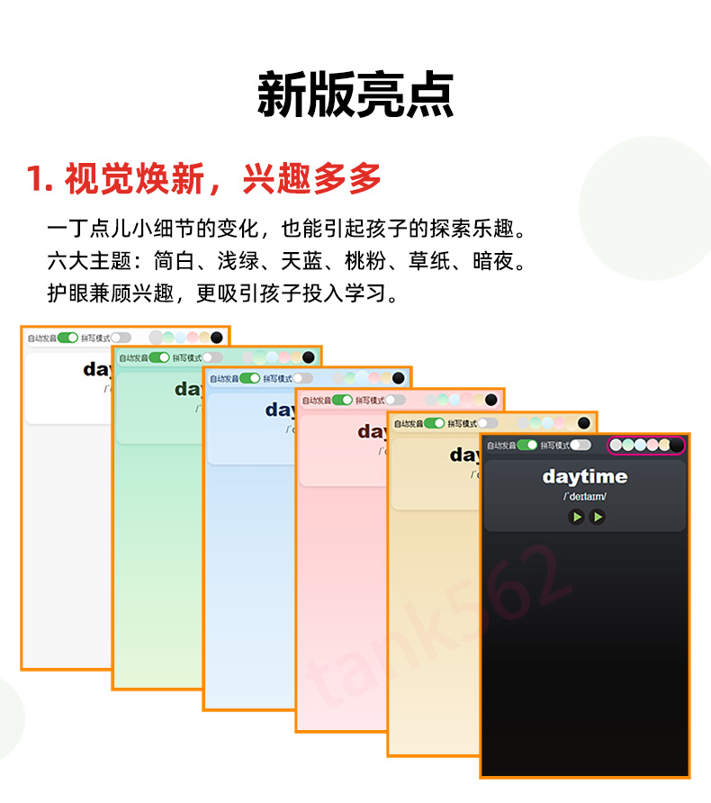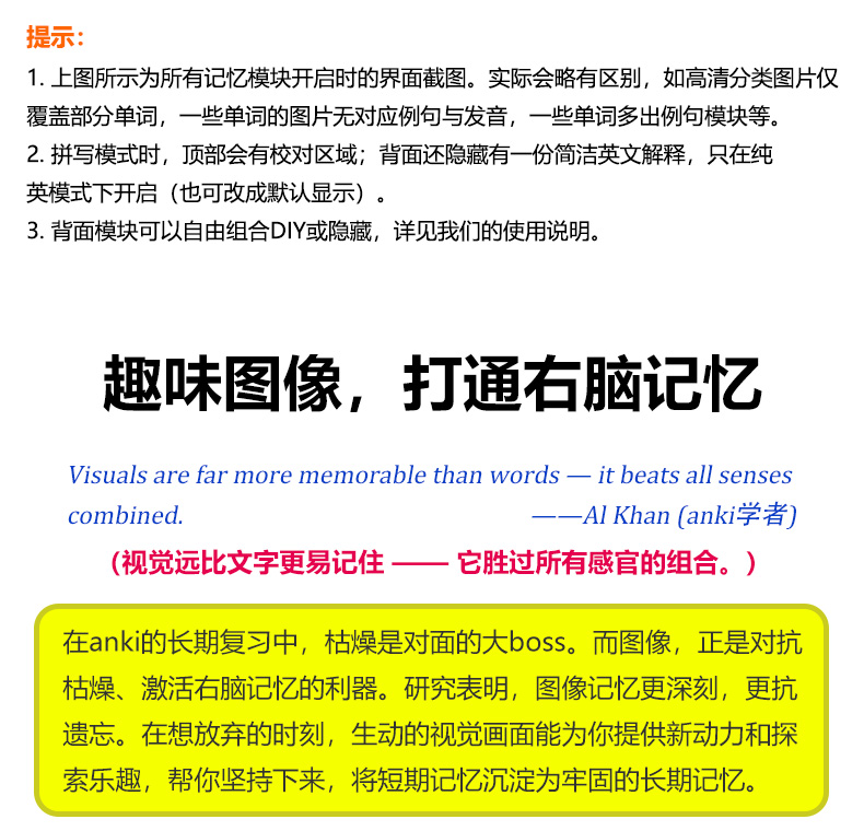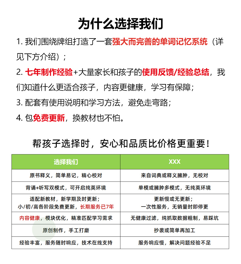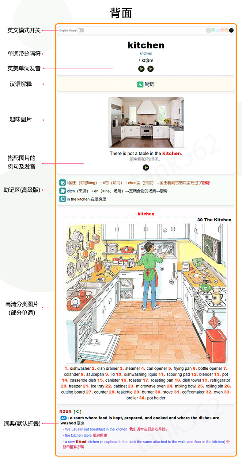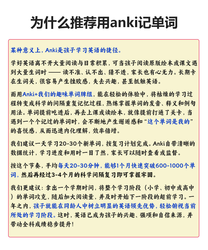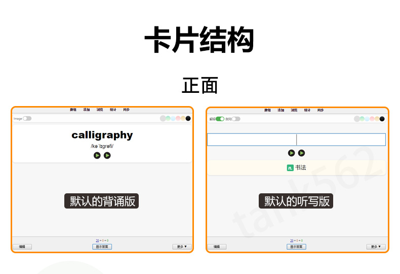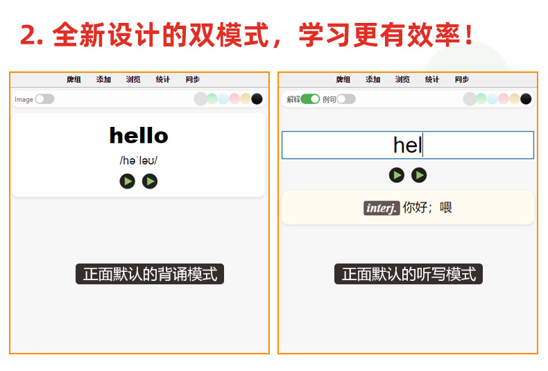 卡片严格按照课本上的单元顺序(非字母排序),细分至每个单元,集成了背诵和听写两个版本(可拓展为更多模式),既方便日常记忆,也便于随堂默写和预习。